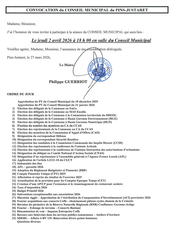 Télécharger la convocation du Conseil Municipal du 2 avril