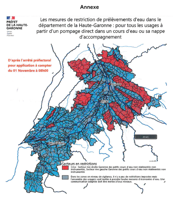 Les secteurs concernés (ainsi que des explications concernant les mesures et restrictions) sont visibles sur le site de la DDT 31 : https://atlasddt31.fr/etiages .