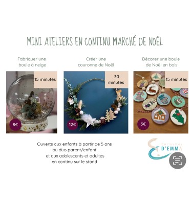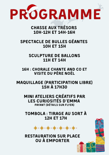 Comme l'année passée : des animations, des stands de créateurs, un atelier maquillage, une tombola, un concert de Chante & co et pleins d'autres surprises seront au rendez-vous !Il se peut même que le Père Noël fasse une apparition.